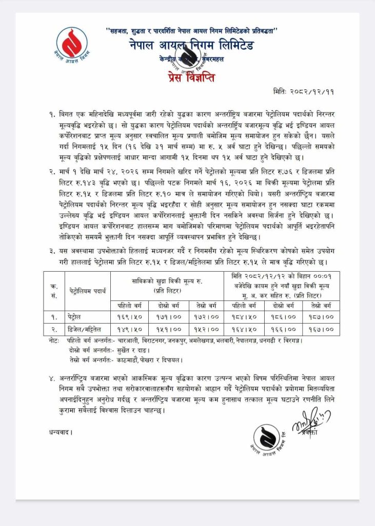 मध्यपूर्वमा जारी युद्धका कारण अन्तर्राष्ट्रिय बजारमा निरन्तर भइरहेको मूल्यवृद्धिको प्रभाव नेपालमा समेत परेको निगमले जनाएको छ।
