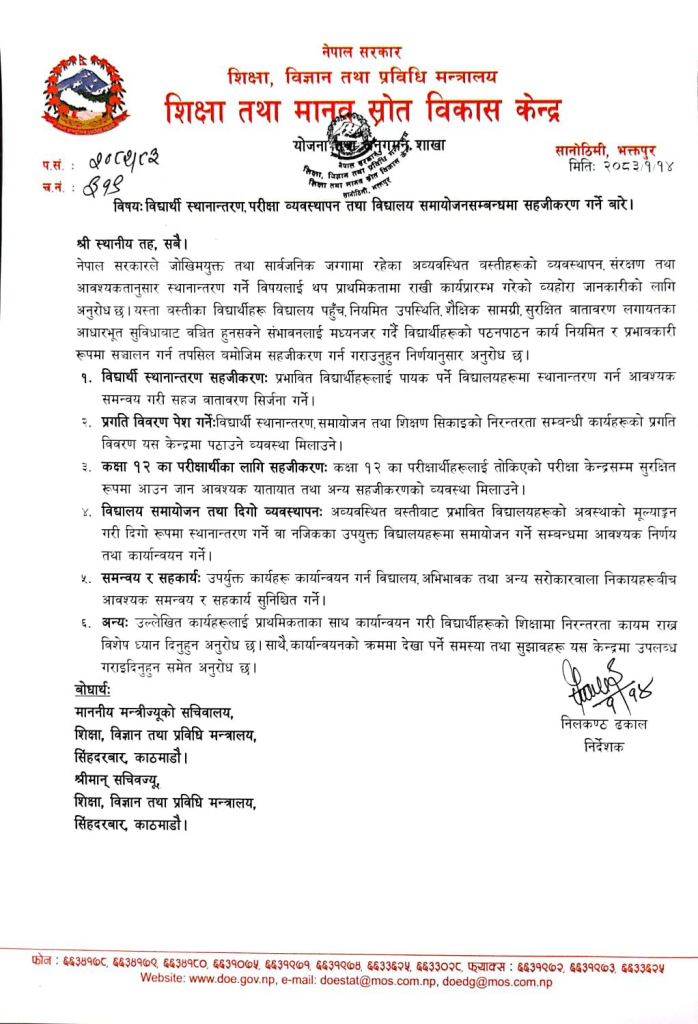 केन्द्रले सुकुम्वासी बस्ती हटाउँदा प्रभावित विद्यार्थीहरूलाई पायक पर्ने विद्यालयमा स्थानान्तरण गर्न सबै स्थानीय तहलाई सहजीकरण गर्न आग्रह गरेको छ। विशेषगरी आजदेखि सुरु भएको कक्षा १२ को परीक्षामा सहभागी हुने विद्यार्थीहरूलाई सहज रूपमा परीक्षा केन्द्रसम्म पुग्ने व्यवस्था मिलाउन र विद्यालय नै प्रभावित भएको अवस्थामा वैकल्पिक व्यवस्था गर्न अनुरोध गरिएको छ।
