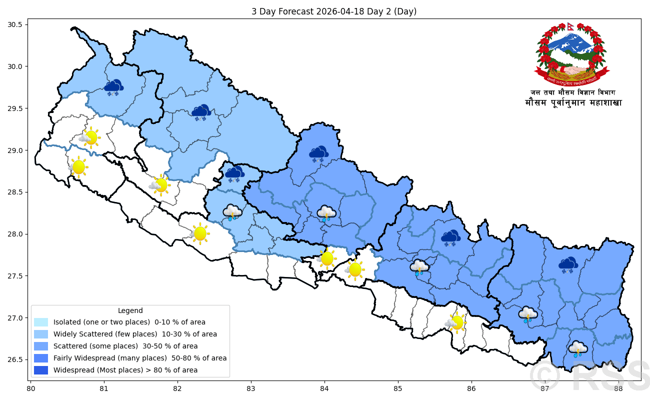 आज केही स्थानमा साधरणतया बादल लागे पनि मौसम मुख्यतया सफा रहने